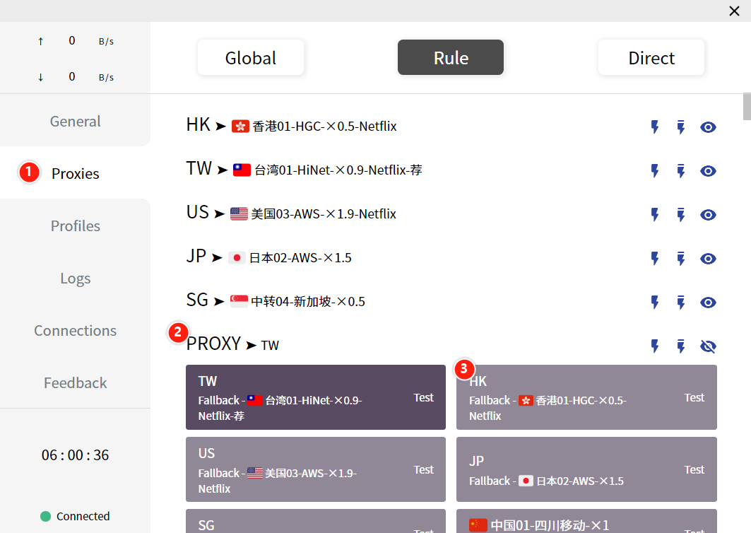 这里我们已经配置好香港、台湾、美国、日本、新加坡这5个地区的节点组,每个节点组内均有若干节点,在出现故障时会自动切换。你只需要点开PROXY组,选择你希望使用的地区即可。
