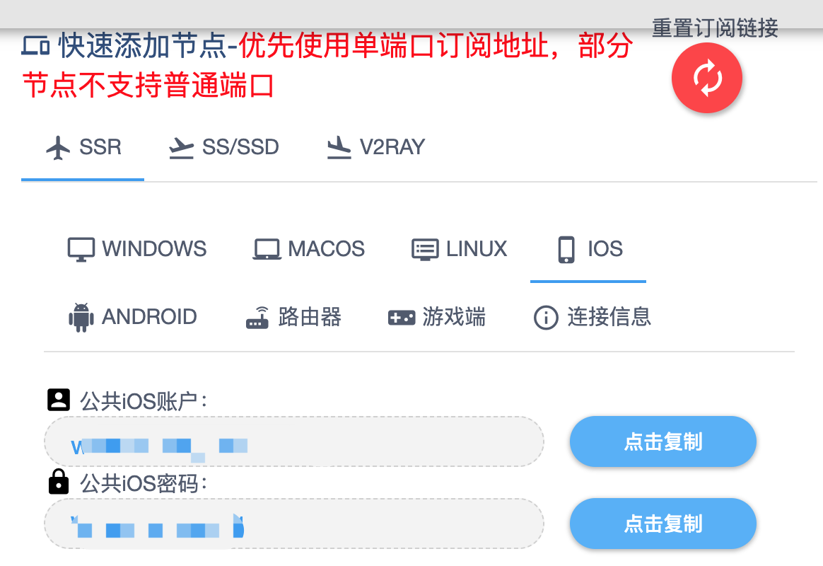 - 依次选择【SSR】—【IOS】,找到公共的App Store 账号和密码