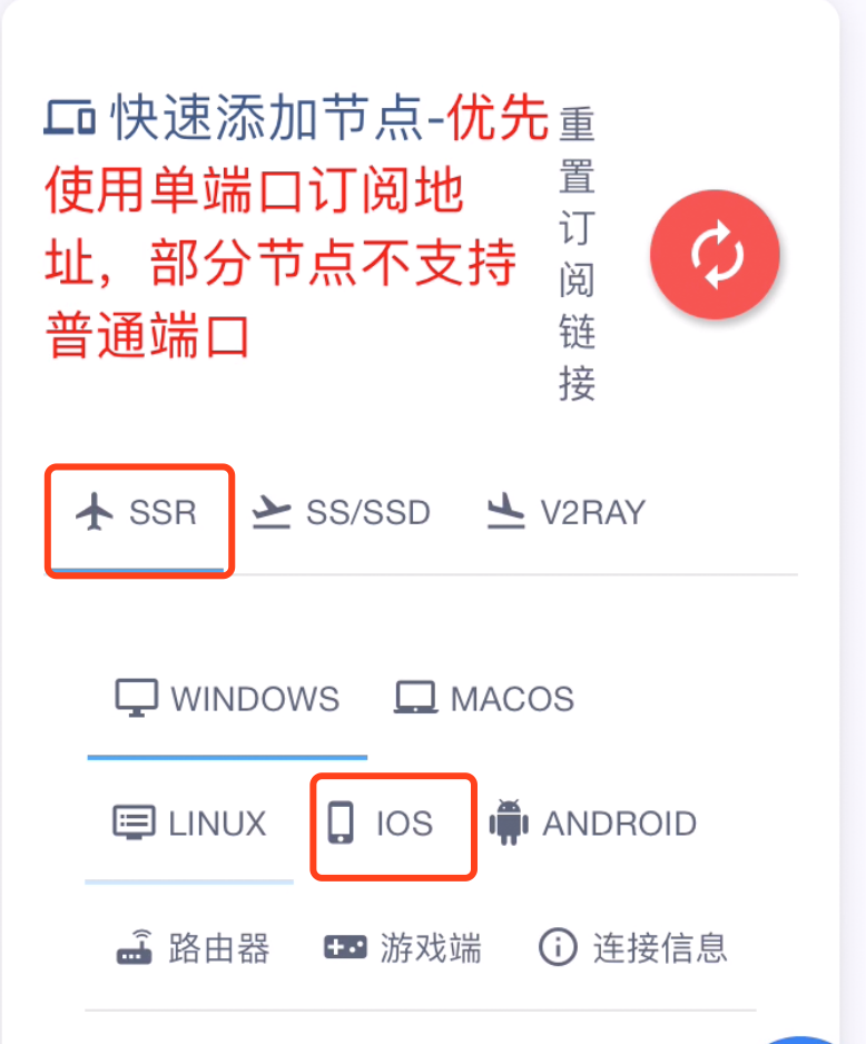 - 向下滑动,分别点击【SSR】—【IOS】,进入节点添加界面
