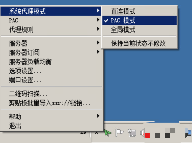 - 服务器选择完毕后,在小飞机图标上执行【右键单击】--【系统代理模式】--【PAC模式】,即可连接互联网。打开google.com 试试吧