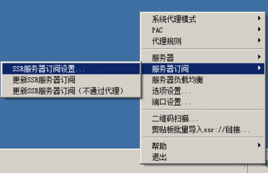 - 在小飞机图标上,分别执行【右键单击】--【服务器订阅】--【SSR服务器订阅设置】,如图