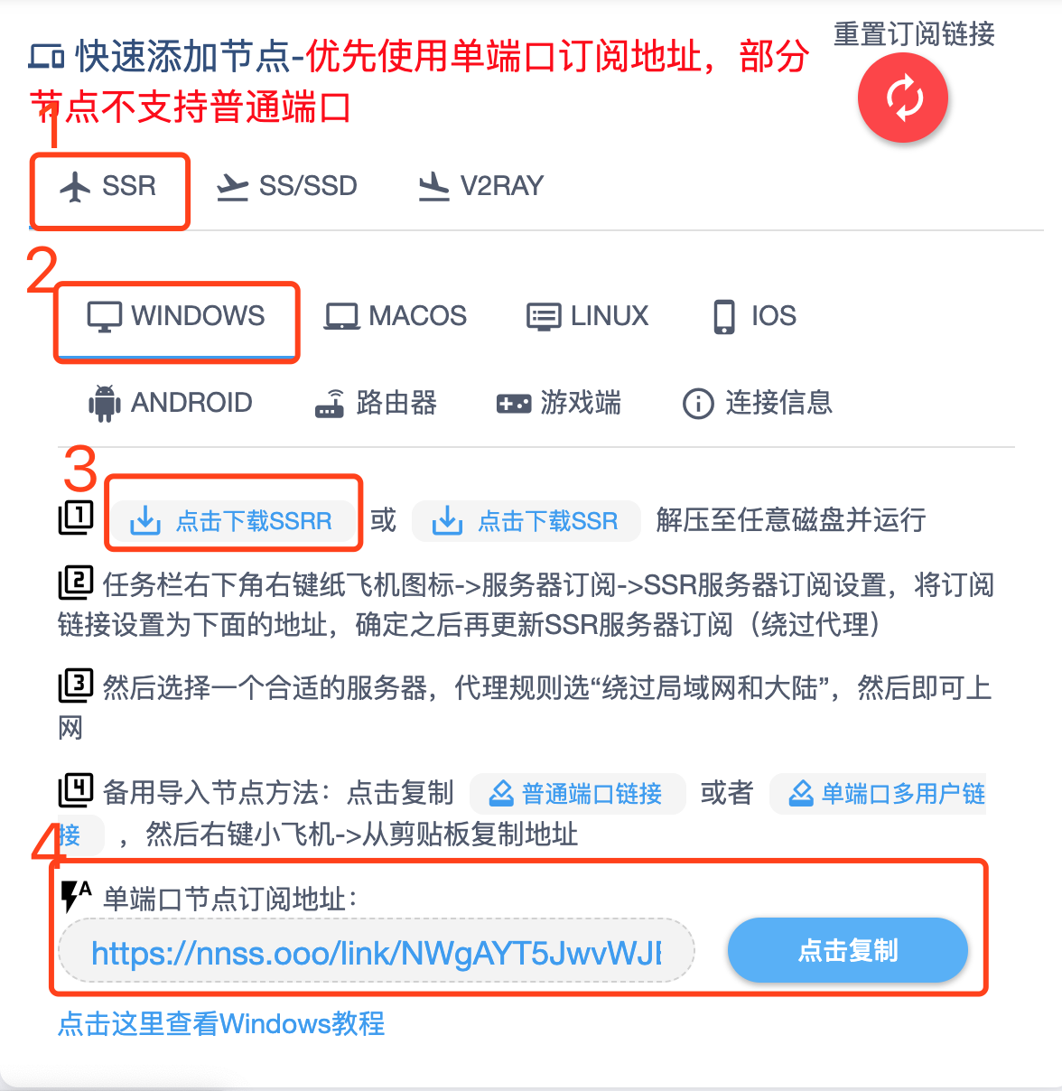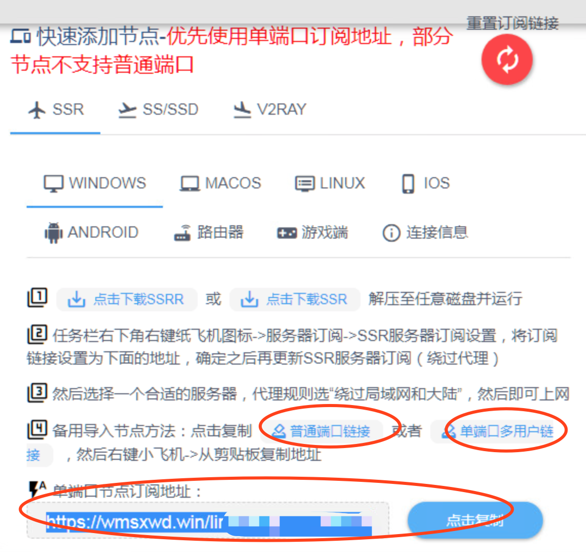 - 如果使用首选方式配置失败,请点击复制我们的备用链接【普通端口链接】或者【单端口多用户链接】复制链接。