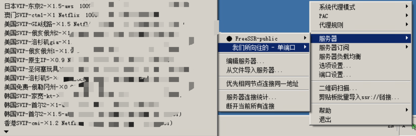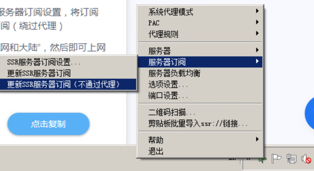 - 在小飞机图标上执行【右键单击】--【服务器订阅】--【更新SSR服务器(不通过代理)】,软件会自动更新你的订阅信息