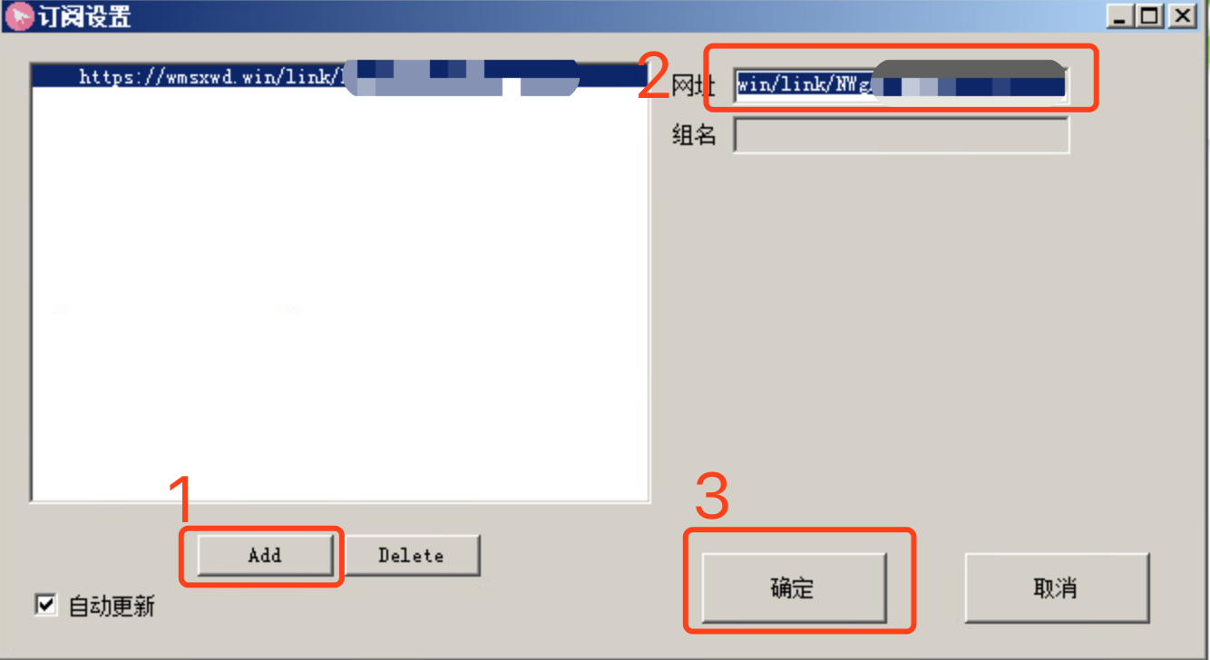 - 在打开的界面上分别执行【单击Add】--【输入框中输入复制的订阅地址】--【确定】按钮,将复制的订阅地址添加到软件中。