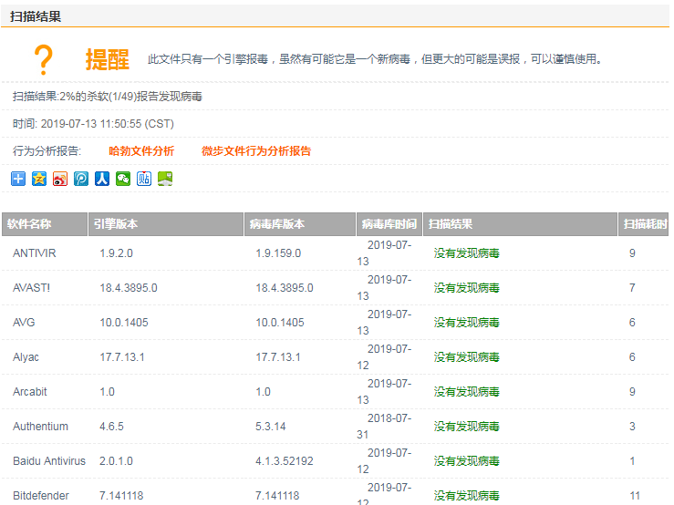 本站提供的软件均保证不包含病毒、木马等,但是本站不保证您在其他网站下载的客户端也是安全的,本站客户端使用多个杀毒引擎扫描过,只有一个误报,确认安全;安全性检测报告请点击链接查看。http://r.virscan.org/language/zh-cn/report/ab3e4d00b5cdf9d297d7ea2bf186fb4b