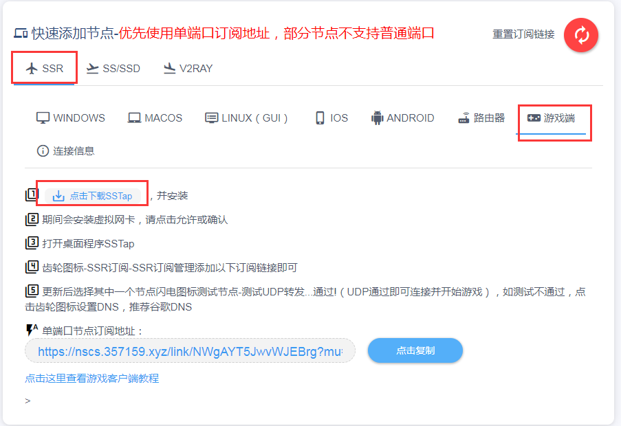 - 登录后默认进入用户中心,向下滑动,找到【快速添加节点】,点击【SSR】-- 【游戏端】 选项卡,然后复制【单端口节点订阅地址】