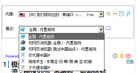 - 仅仅网页浏览器(跳过中国站点):网页浏览器访问国外走加速,但是仅仅加速网页浏览器,其他的比如游戏、git客户端、ssh客户端和一些开发工具都是不走加速服务的