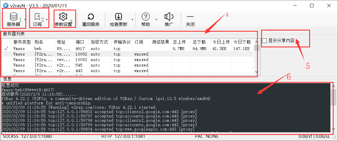 v2rayN.exe打开主界面,长这样- 【1】:服务器管理菜单,可以进行添加/删除服务器,移动服务器顺序,管理当前使用的服务器,测速,测试延迟等等