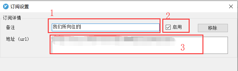 V2rayN软件,在主界面依次点击【订阅】--【订阅设置】,打开订阅设置界面,如下图依次填入【备注】,【启用勾选】,地址填写上一步复制的,【自己的订阅地址】,然后点击最下面的【确定】按钮