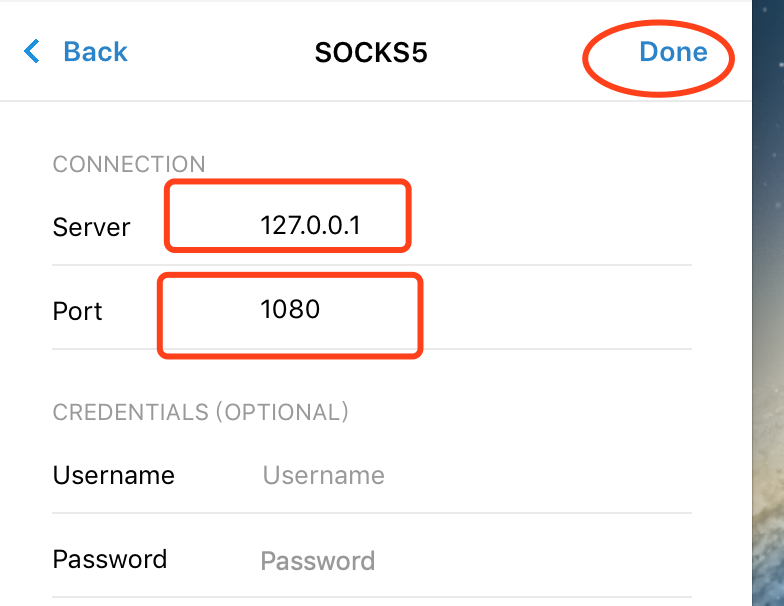 IP地址为【127.0.0.1】 端口写【1080】,然后点击【确定/Done】