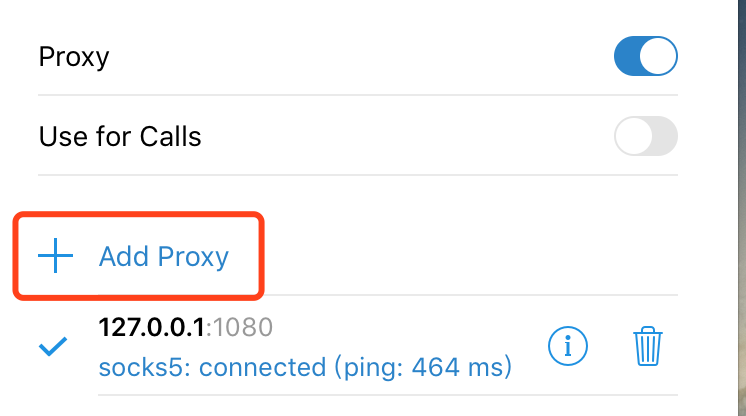 如果之前已经登录过,分别执行【设置】--【代理】--【添加代理】--【socks5】,IP地址写127.0.0.1, Windows用户端口请填写【1080】,MACOS用户端口请填写【1086】,然后点击确定